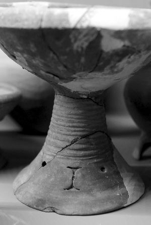 “它的学名叫陶豆,是新石器时期的,距今有6000年了,是古人用来放肉酱的。”南博专家说,这件文物是从邳州大墩子遗址出土的。陶豆的腿上,雕刻着“工”字形的花纹,两边各有俩小点。连在一起,像极了“越狱兔”。