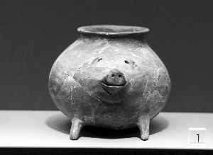 南博专家说,这其实是“猪形陶罐”,当年在高邮龙虬庄遗址出土的。当时出土了10只猪形陶罐,罐子上的“猪”长相酷似,又夸张,制作水平和审美情趣令人折服。这些文物距今7000年至5000年之间。“这些小猪,说明当时人类已经圈养猪了,猪已经成了家畜。”