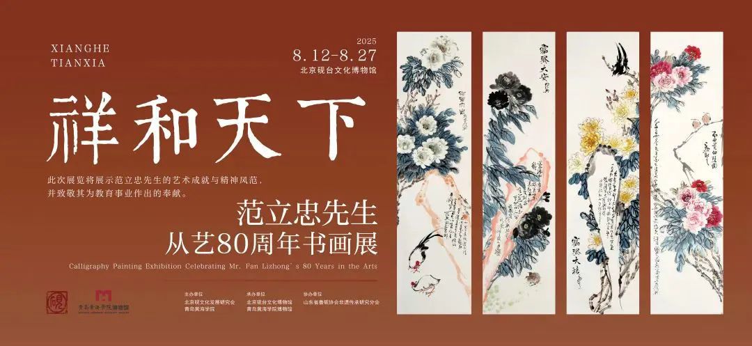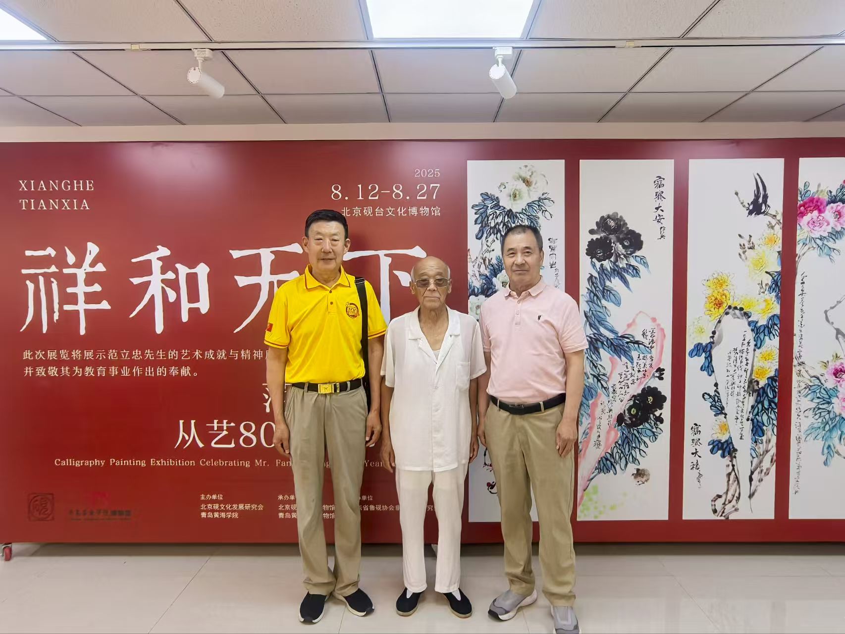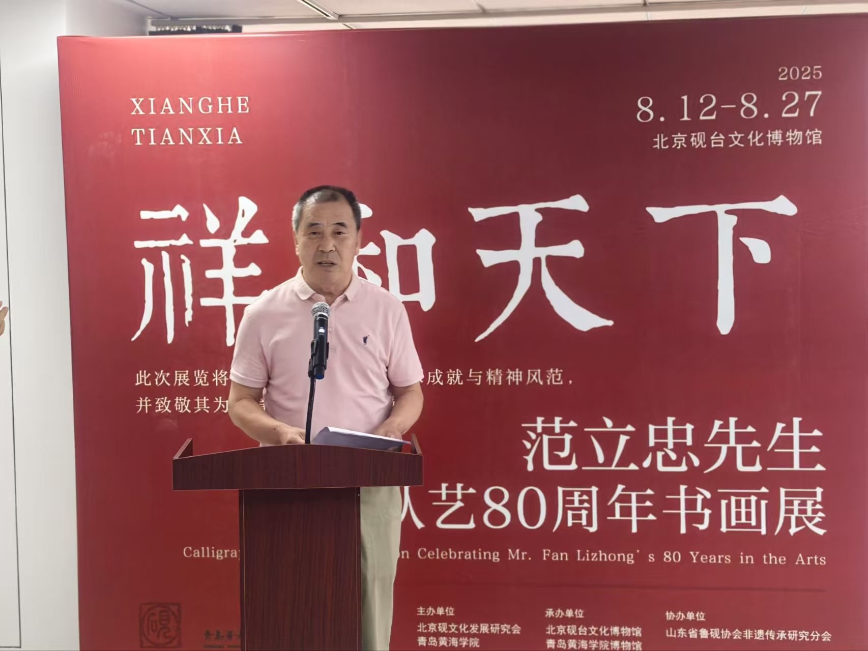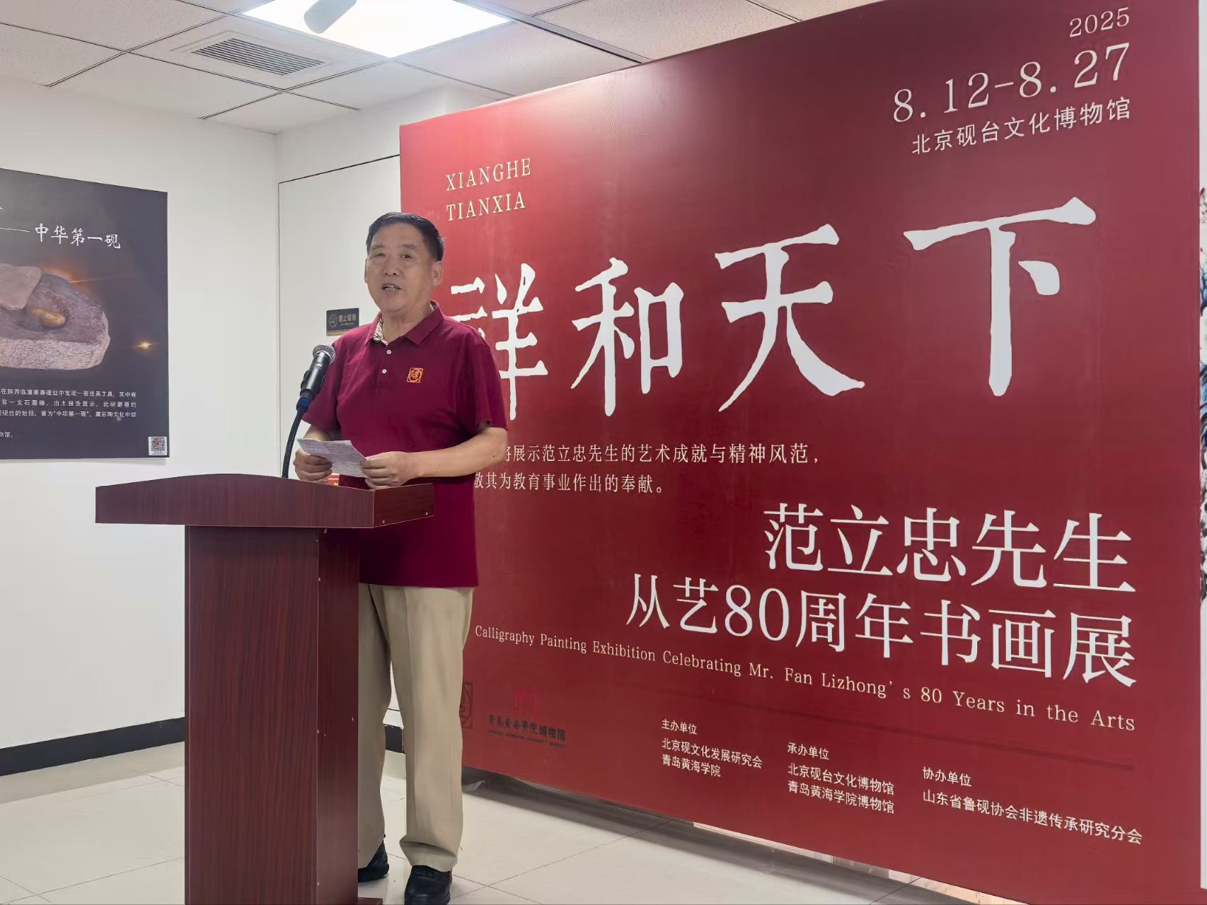 2025 年 8 月 12 日,由青岛黄海学院与北京砚文化发展研究会联合主办,青岛黄海学院博物馆与北京砚台文化博物馆共同承办的 “祥和天下 —— 范立忠先生从艺 80 周年书画展”,在北京砚台文化博物馆盛大开幕。作为承办单位之一,青岛黄海学院博物馆全程参与展览筹备与落地,携手各方共同为这场横跨八十年的艺术盛宴搭建了璀璨舞台,向世人展现范立忠先生的艺术人生与教育情。