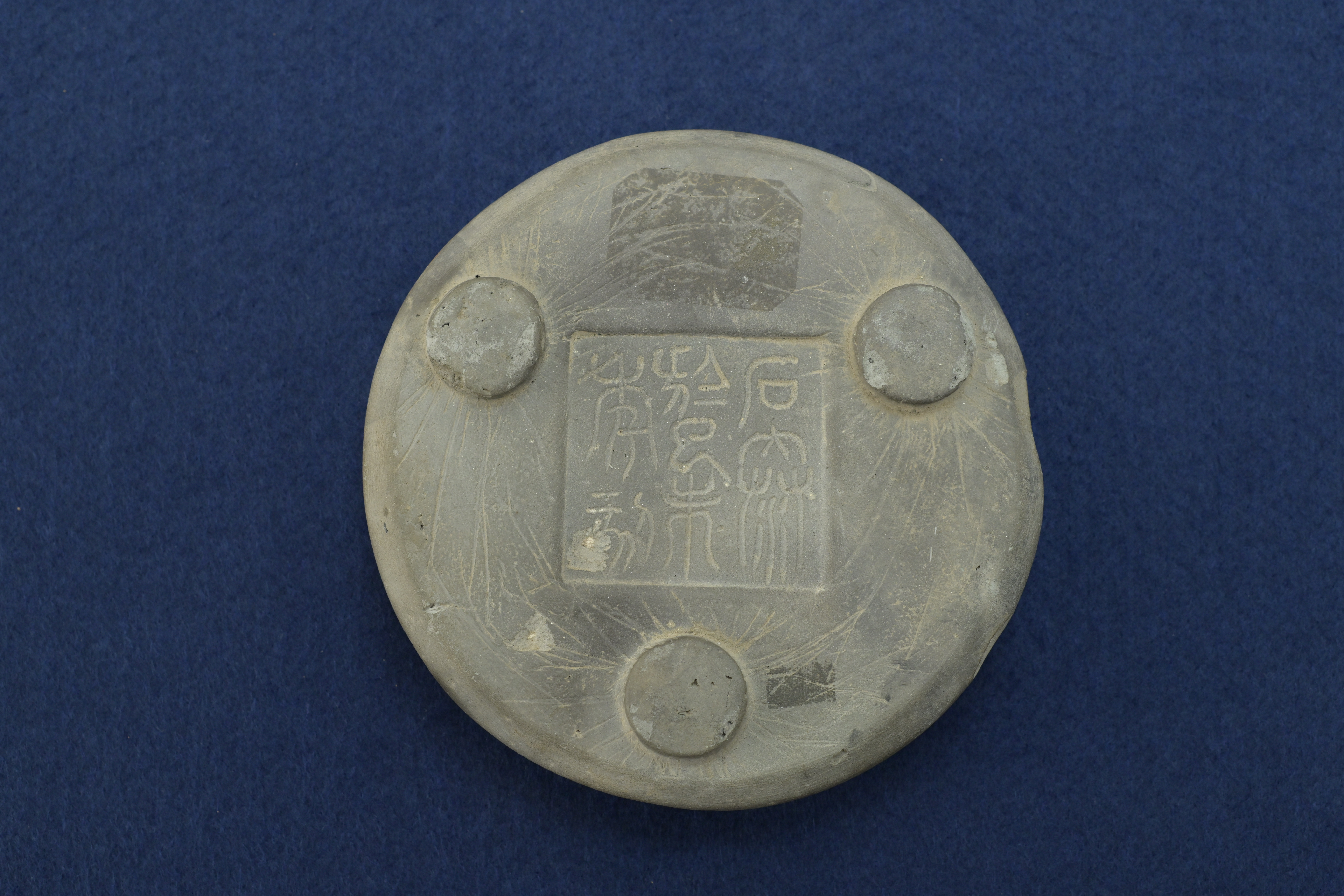 砚台背面,“石泰於巳未年刻” 的小篆清晰可见。篆书字体古朴典雅,笔画圆润规整,每一笔都仿佛在诉说着过往的岁月故事。“石泰” 作为镌刻者,在巳未年留下这一印记,为我们探寻砚台的历史脉络提供了关键线索,也让我们得以一窥元代文人或工匠的文化审美与技艺水准。同时,砚背的三足设计,使砚台放置时更加稳固,既体现了实用价值,又与整体圆形造型相呼应,展现出和谐的美感。