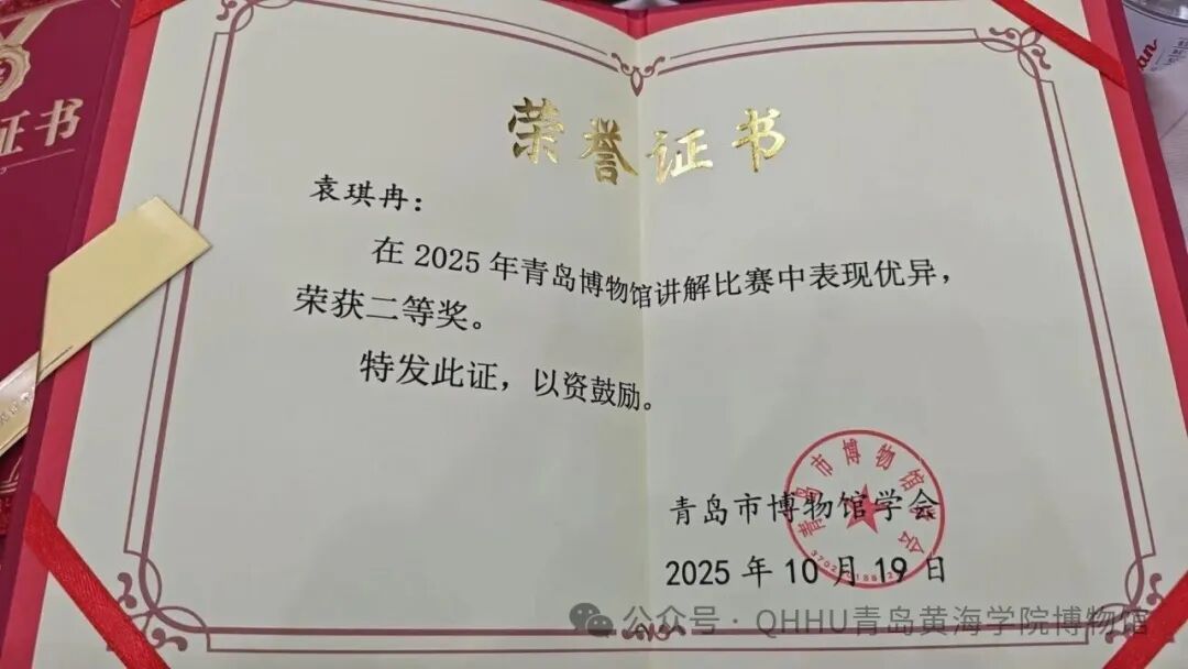 两项赛事,两种赛道,却同样见证着袁琪冉老师的专业坚守与成长。这份成绩的背后,是她日常对文博知识的不断深耕,是对研学课程设计的反复打磨,更是对文化传播与教育事业的满腔热忱。未来,青岛黄海学院博物馆将以袁琪冉老师为榜样,持续加强讲解员与研学指导师队伍建设,深耕青岛本土文化资源,推动文博传播与研学教育深度融合。