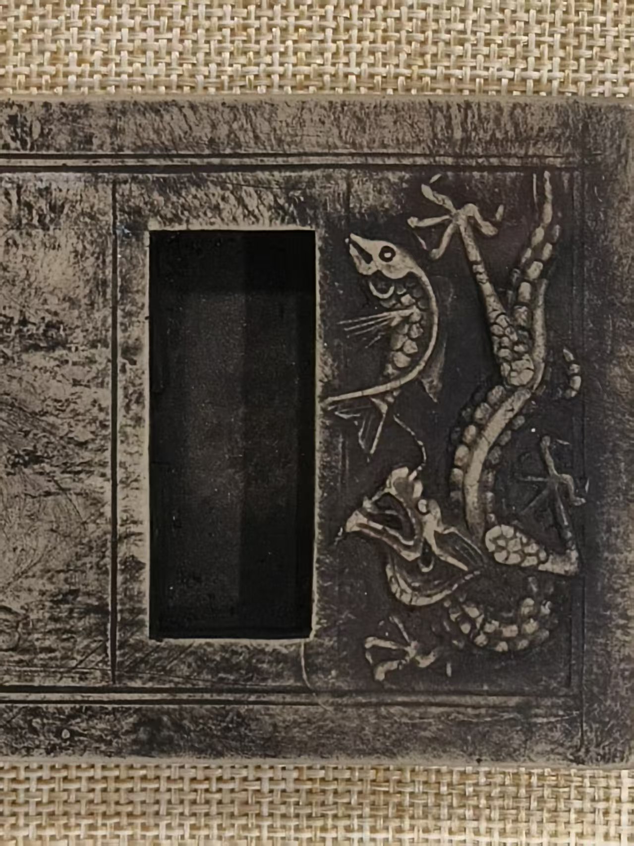 这方澄泥砚上的龙鱼纹堪称一绝。从形制上看,龙身蜿蜒曲折,似在云海间翻腾游动,鱼身灵动鲜活,仿佛在水中自在遨游,二者相互映衬,构成一幅和谐的画面。雕刻工艺更是精湛绝伦,工匠以细腻的刀法,将龙鱼的每一处细节都刻画得栩栩如生。龙鳞清晰可见,鱼眼炯炯有神,仿佛赋予了它们生命。