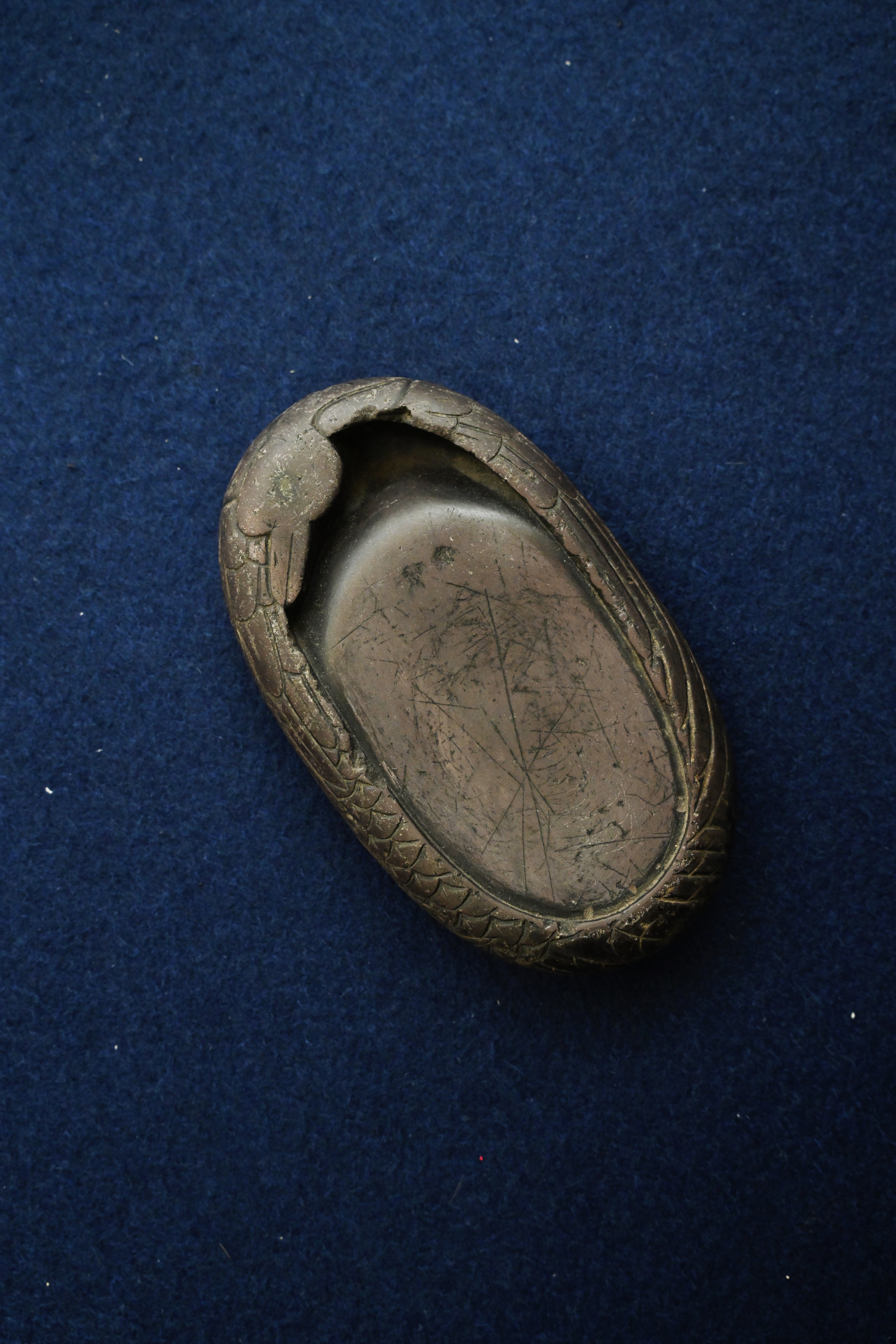 鹅形砚的流行,与明代文人的审美趣味及文化典故紧密相关。自宋代 “羲之爱鹅” 典故入砚,鹅便成为文人喜爱的题材,象征着优雅灵动的艺术意境。明代手工业蓬勃发展,文人深度参与砚台设计,鹅形砚的工艺与造型愈发精致。这方明代鹅形端砚,既承袭了宋代鹅式砚的文化脉络,又展现了明代端砚雕刻 “形意合一” 的风格特点,见证了明代文房器物从实用到艺术化的发展进程,是研究明代砚文化与手工业发展的重要实物资料。