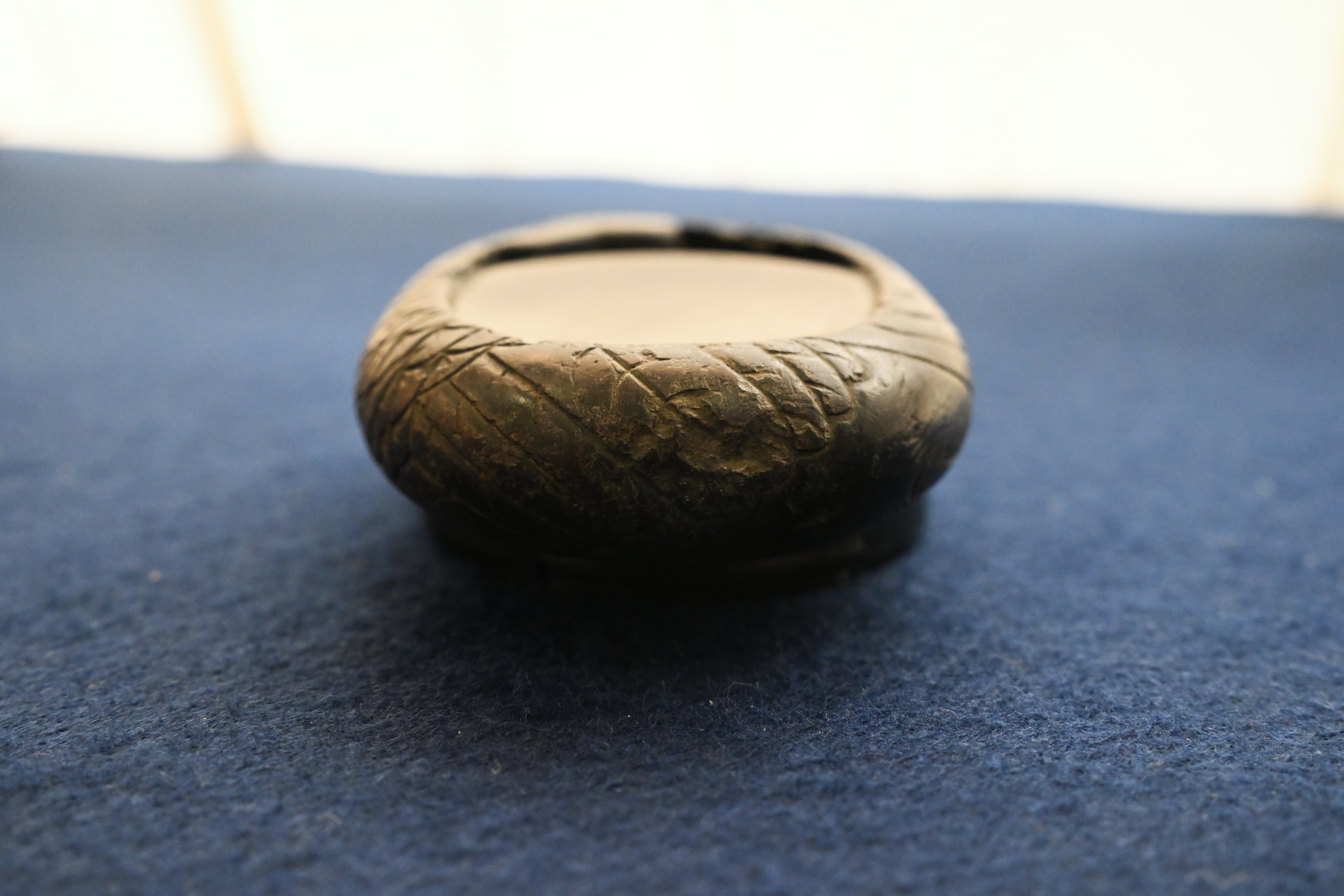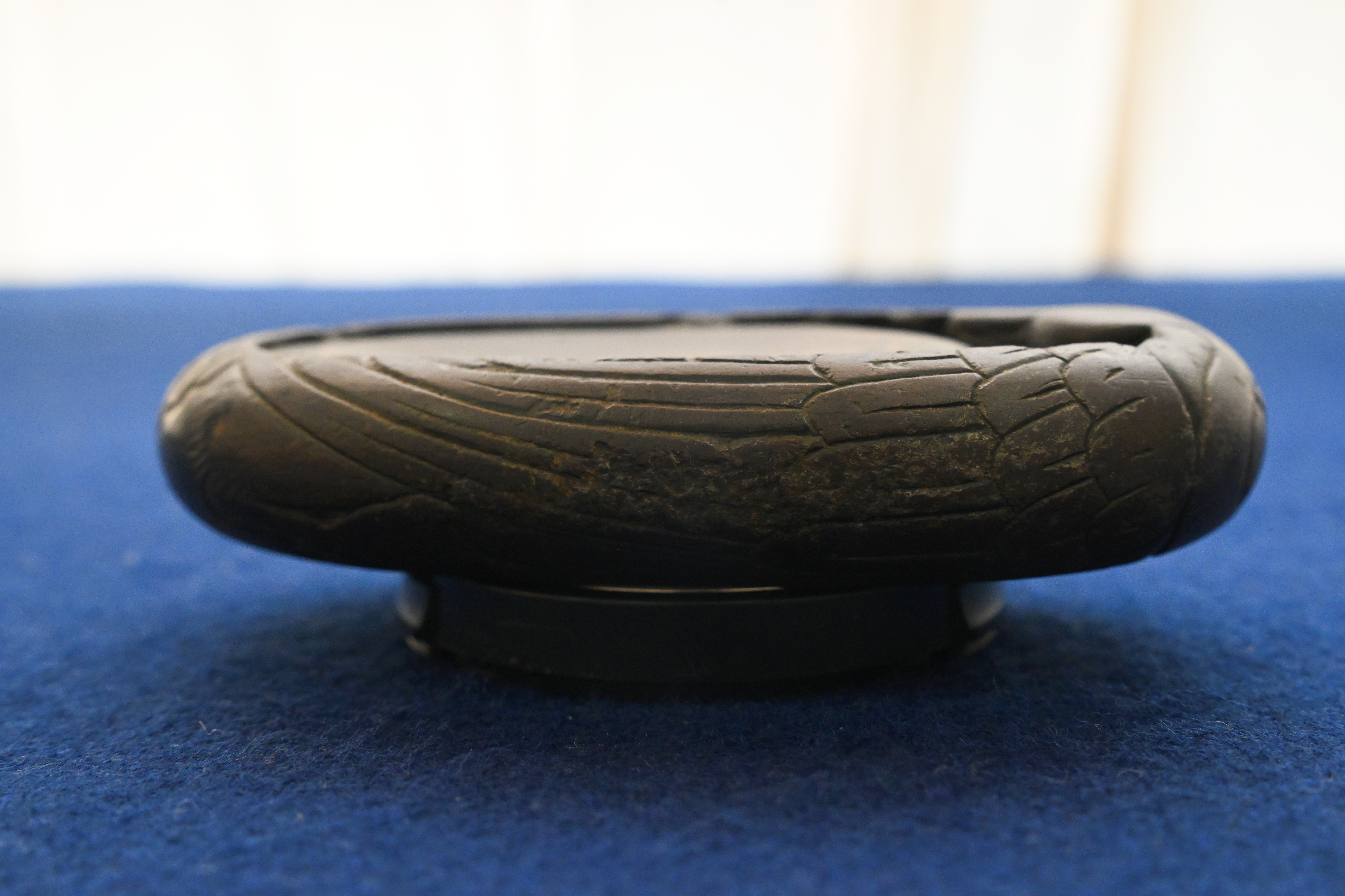 作为明代文房常用之器,这方鹅形砚的功能设计贴合文人日常书写需求。砚堂开阔平整,利于研磨墨汁,发墨效率高;砚池与砚堂衔接自然,倒水研墨时水量可控,避免墨汁溢洒。同时,其鹅形造型并非单纯装饰,而是明代匠人 “因材施艺” 理念的体现,既保留了端砚的实用属性,又通过仿生设计赋予砚台灵动的艺术美感,是实用与审美完美融合的文房珍品。