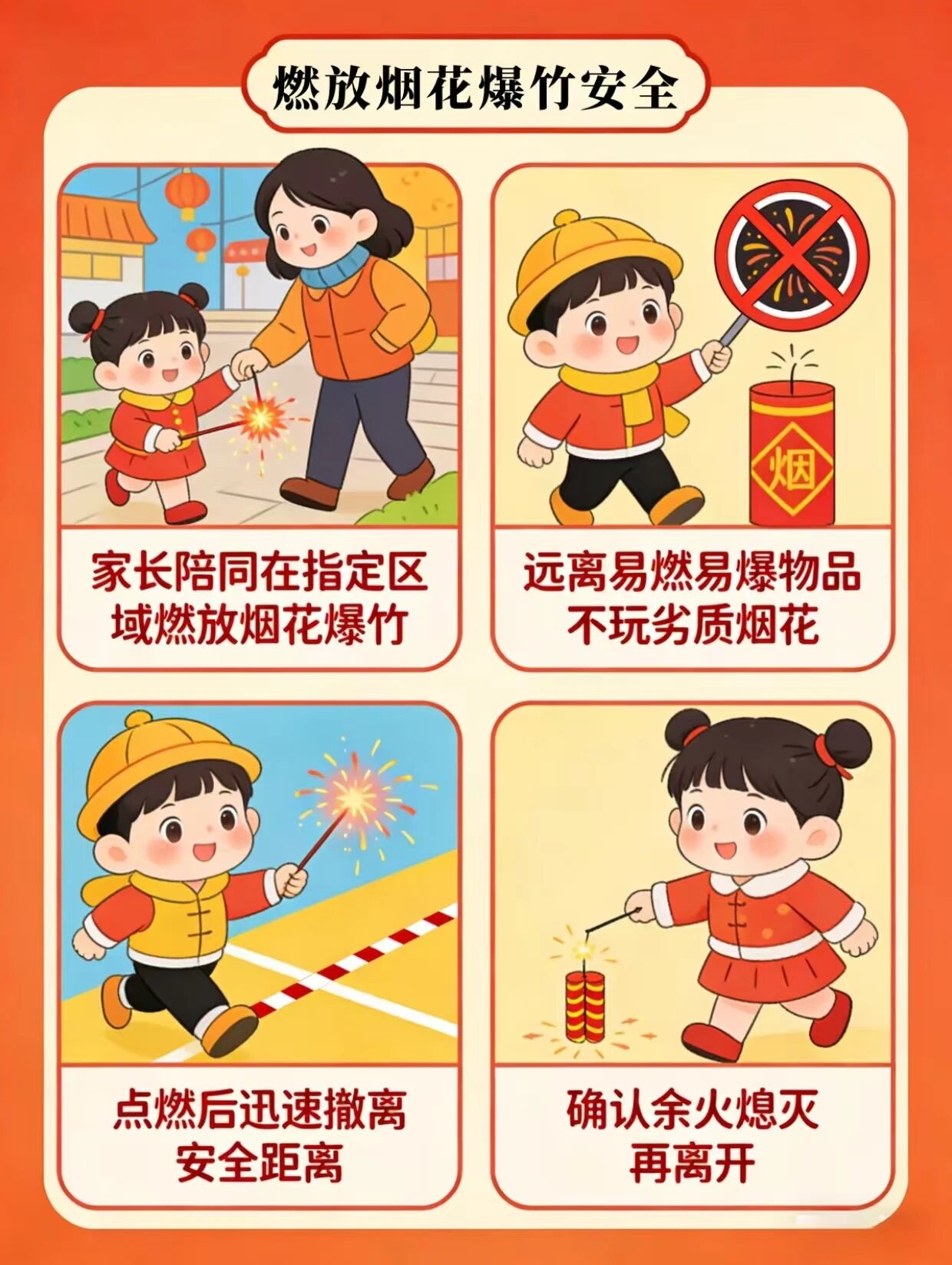 3. 燃放时保持安全距离,不手持燃放,燃放后及时清理残留碎屑,谨防火灾隐患。