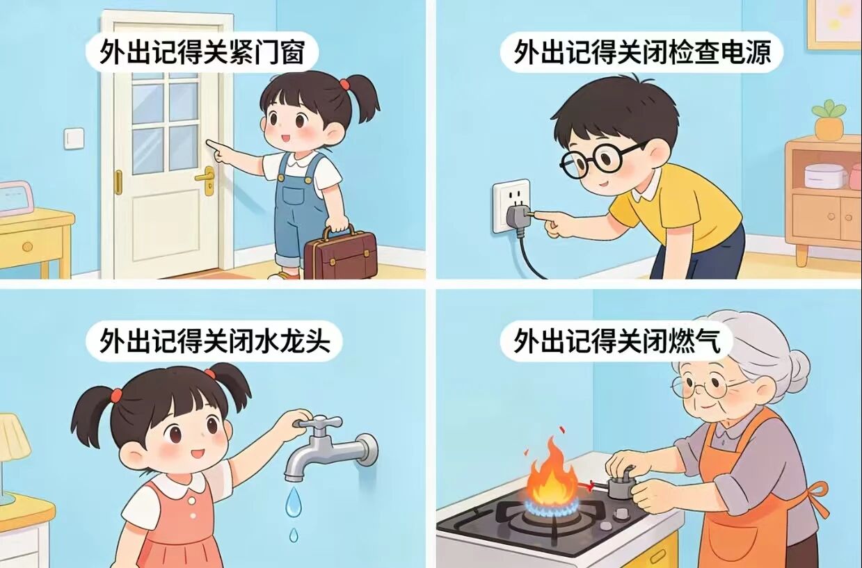 2. 居家或外出前,务必检查并熄灭明火,清理阳台、楼道内的易燃物品,保持消防通道畅通。