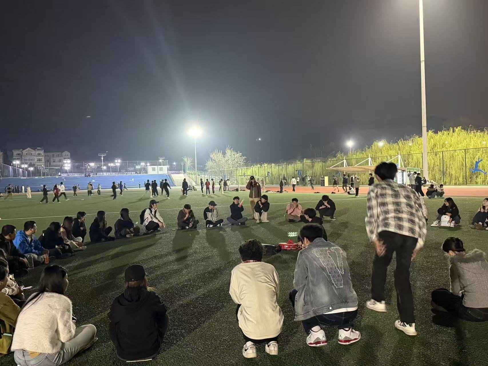 夜幕降临,华灯初上,操场灯光璀璨,绿茵场地在夜色中格外温馨。活动开始前,同学们便陆续从教室、宿舍结伴抵达现场,满怀期待地等候活动开启。随着活动正式启动,现场氛围迅速热烈起来,有学生主动牵头带动互动节奏,全体人员跟着节拍拍手欢笑,其乐融融;部分学生自发组织趣味小游戏,在协作配合中增进交流、拉近彼此距离。跑道上,不少同学结伴慢跑、悠闲漫步,迎着晚风舒展身体,卸下学习与生活的压力。大家告别了书桌前的久坐、告别了宿舍里的慵懒,在开阔的操场上舒展身体、释放情绪,每一个奔跑的身影、每一张灿烂的笑脸,都勾勒出青春最鲜活的模样。大家暂时放下了书本与电子设备,在开阔的操场上舒展身体、交流心声,尽情享受着集体活动的快乐。