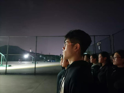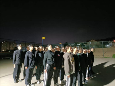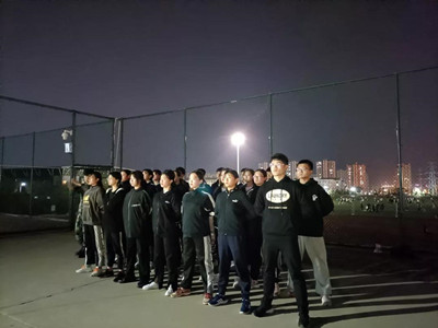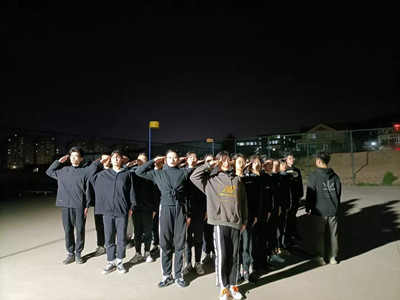 停止间转法动作要领:两快、一稳、一准、一正。灯光下的影子是他们认真的样子,学生教官反复练习,严格要求自己,步伐整齐划一,英姿飒爽,彰显了学前子的英雄气概。
