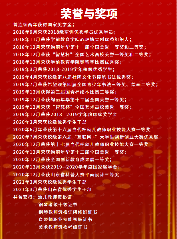 李雯雯同学在学习方面不仅努力钻研,其他的有助于提升自我的活动也都会参与,在校期间她积极参加各类比赛活动,获得了很多荣誉,她曾连续两年获得国家奖学金等国家级荣誉共20余项,校级和院级荣誉共30余项,考取各类证书共5项。