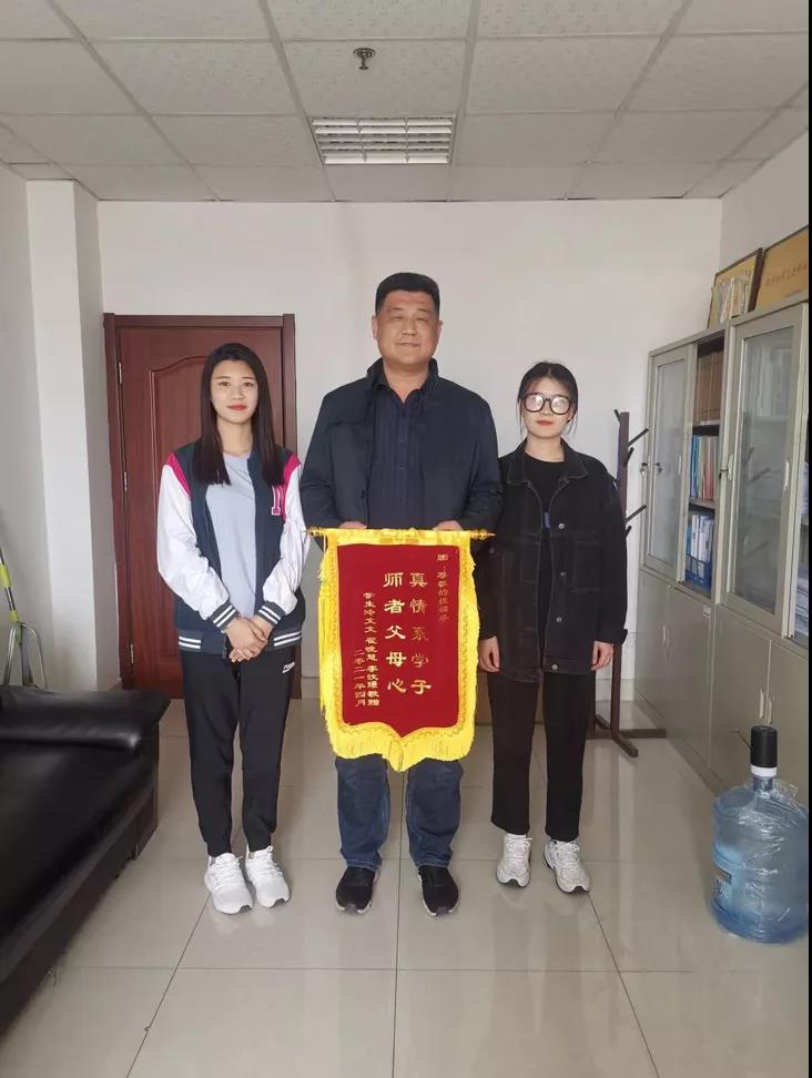 近日,学前教育学院2020级早期教育专科4班学生冷文文、李汶璟,翟晓慧,将绣有“真情系学子,师者父母心”的锦旗以及感谢信送到了学生工作部部长赵国光、学前教育学院院长助理王剑、辅导员刘燕手中,表达了她们对学校老师深深的谢意。