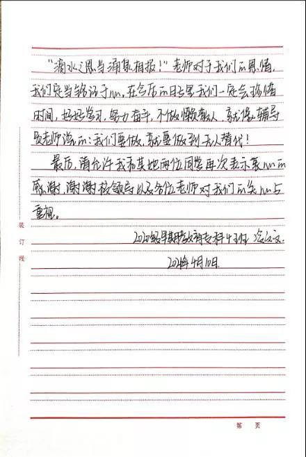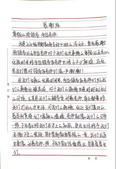 为此,三位同学敬赠锦旗、写表扬信衷心感谢学院领导和老师。锦旗虽轻,情意却重,信中,同学们表示会将老师的恩情铭记于心,努力学习,不辜负校领导以及各位老师的关怀和照顾,字里行间流露出学生对老师在生病期间辛劳付出的赞美和感谢,句句感激的话语无不证明着老师在教学方面兢兢业业,在生活细节上的无微不至,对孩子们的无私付出。