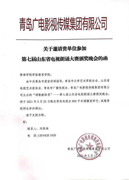2021年5月23日,我校受到青岛广电影视传媒集团有限公司的邀请,由学前教育学院舞蹈教师葛月华老师和张睿智老师带领33名学前教育学生前往青岛电视台参加由中共青岛市委宣传部指导,青岛市文学艺术界联合会,青岛市广播电视台,青岛广电影视传媒集团有限公司主办的“颂歌献给党”——第七届山东省电视朗诵大赛颁奖晚会,于5月23日晚在青岛电视台800平米演播室举行。