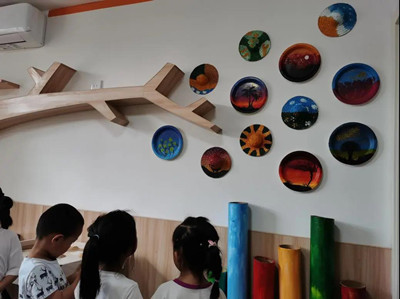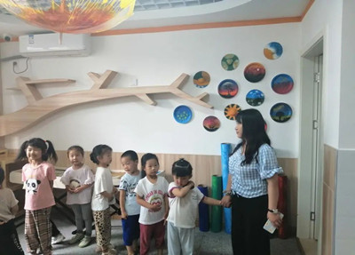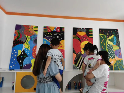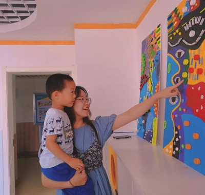 (王美旭、冯俊科:带小朋友一起欣赏美工画。)