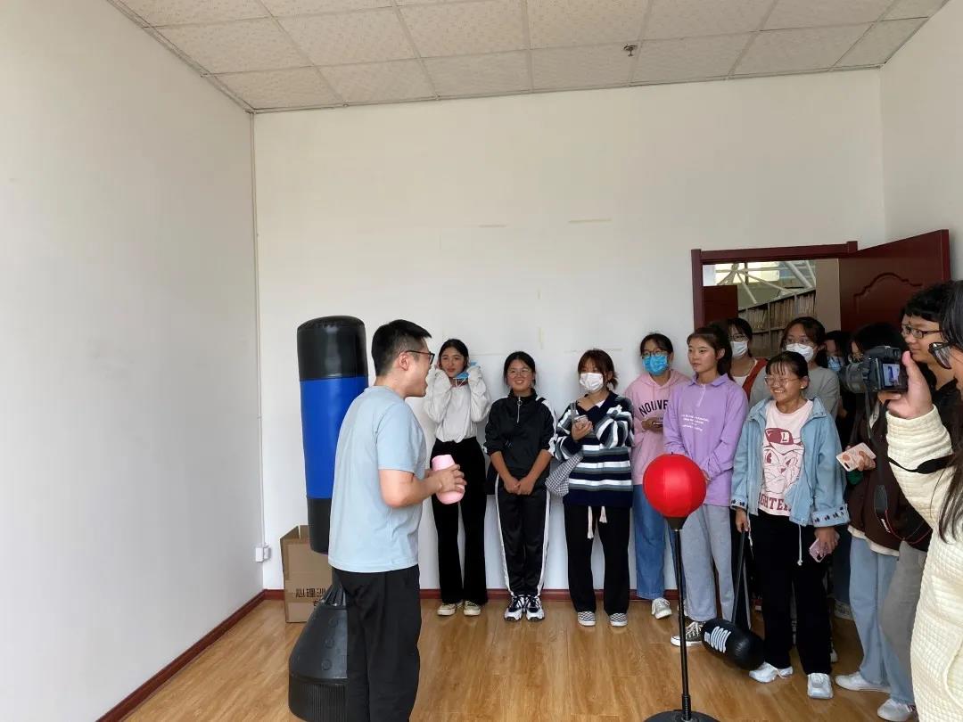 其次,李老师带领大家参观了心理咨询室、箱庭疗法室、宣泄室、音乐放松室等房间,并在一旁讲解了各个房间的功能和作用。在本次参观中,同学们对各房间产生了浓厚的兴趣,还在老师的带领下体验了一把。