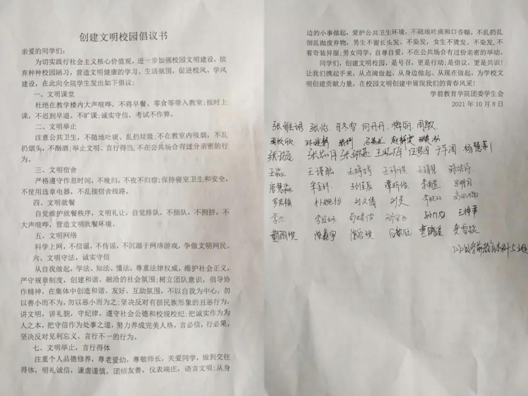 为切实践行社会主义核心价值观,进一步加强校园文明建设,摒弃种种校园陋习,营造文明健康的学习、生活氛围,促进校风、学风建设,创建文明校园,学前教育学院举办创建文明校园倡议书签字活动,学前教育学院全员参与。