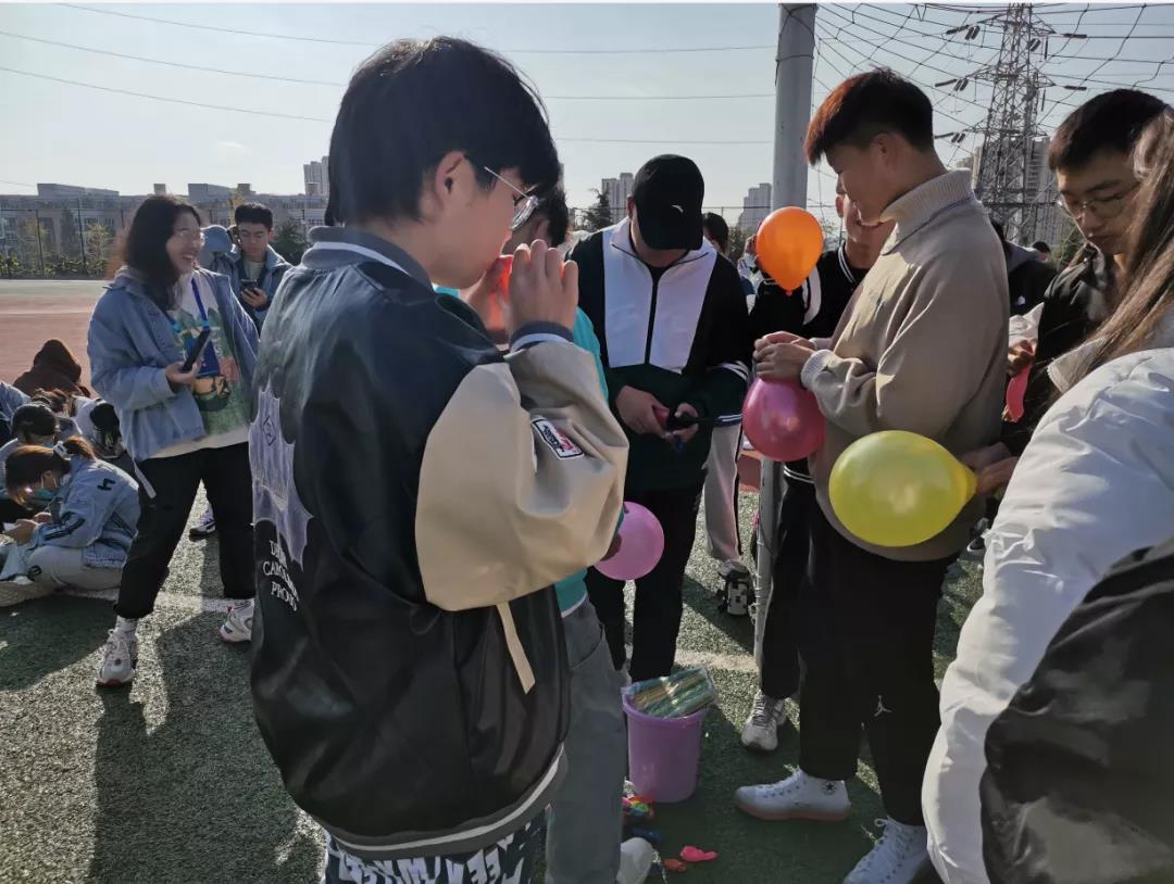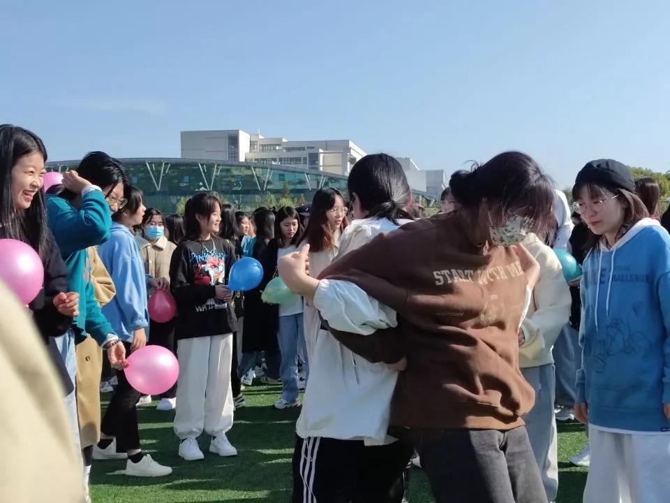 首先进行的是背对背拥抱,赛场上的加油叫喊是那样热烈沸腾!每队成员两两一组,传递式将气球用背部挤爆。(赛后的气球皮已经被清理完毕,大家平时也要保持好校园卫生哦!)