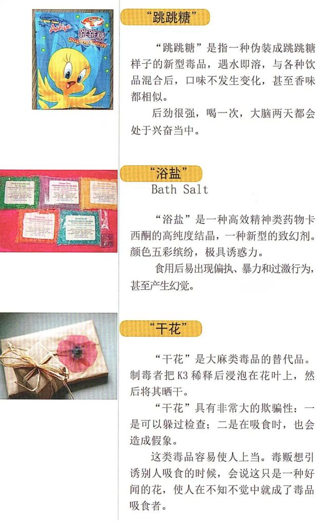 除了以上常见的毒品种类外,目前市面上还出现了不少毒品的“伪装品”,极具欺骗性和诱惑性。切记不要随便吃陌生人给的东西,不要随便吃来路不明的零食、饮料等,以防被不法分子毒害。