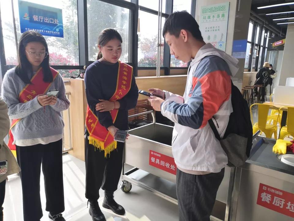 活动中,志愿者利用午间就餐时间,在食堂设立文明引导岗,监督学生就餐排队一米距,餐余垃圾的分类归置,餐具的摆放和光盘行动的落实情况等。