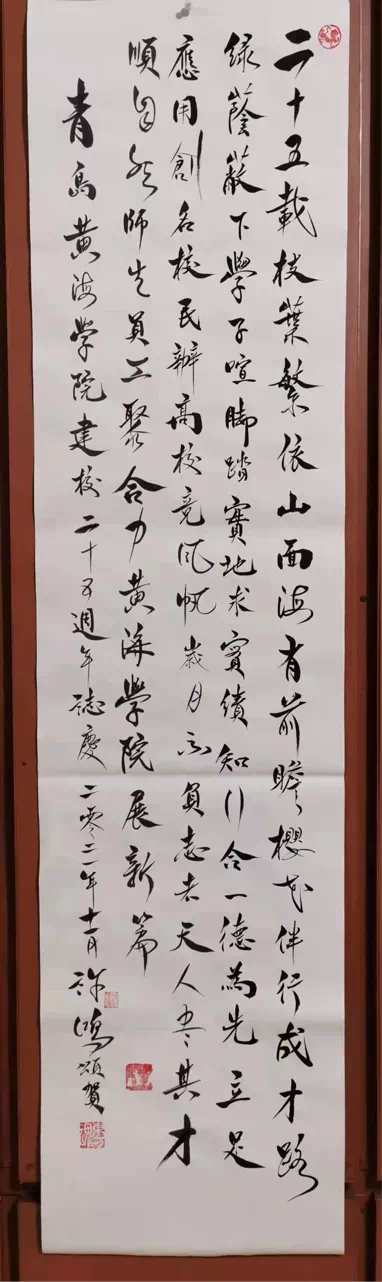 诗不仅体现了黄海的文化内涵,优美的词藻还表达了对黄海的热爱。许教授挥毫落纸如云烟,他将祝福融于墨中,挥就笔墨,扬洒于纸间。许鸿教授还精心录制了视频,在视频中可以看出许鸿教授对黄海的满心祝福。
