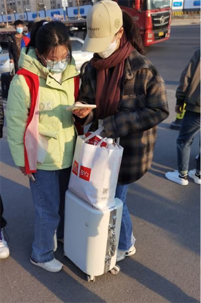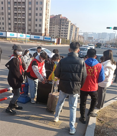 连日来的寒冷天气,阻挡不住志愿者们的热情,早上7:30志愿分队的成员们便在学校南大门前整装待发,以最饱满的姿态迎接返校的同学们,用最热情的状态来帮助着行李沉重的同学们,用最严谨的态度对待疫情下的返校要求工作,他们身着红马甲,仔细认真地检查着每位返校学生的健康码、行程码与核酸检测报告,志愿者们谨慎地为行李消毒、为返校同学提供更换口罩......迎生现场秩序井然,教师与学生志愿者们一起严守着守护校园、严防疫情的“入口关”。