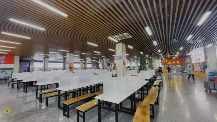 进入学校餐厅,在门口会进行智能的体温检测。随后进入食堂,大大小小的饭桌凳子被整齐排列放置,所有窗口停止店内就餐,学生点餐时要在店外排队等候,保持一米线距离。食堂工作人员也需做好个人防护和清洗消毒工作;从业人员必须一律佩戴口罩,加强店内的通风,保持店内环境整洁干净。