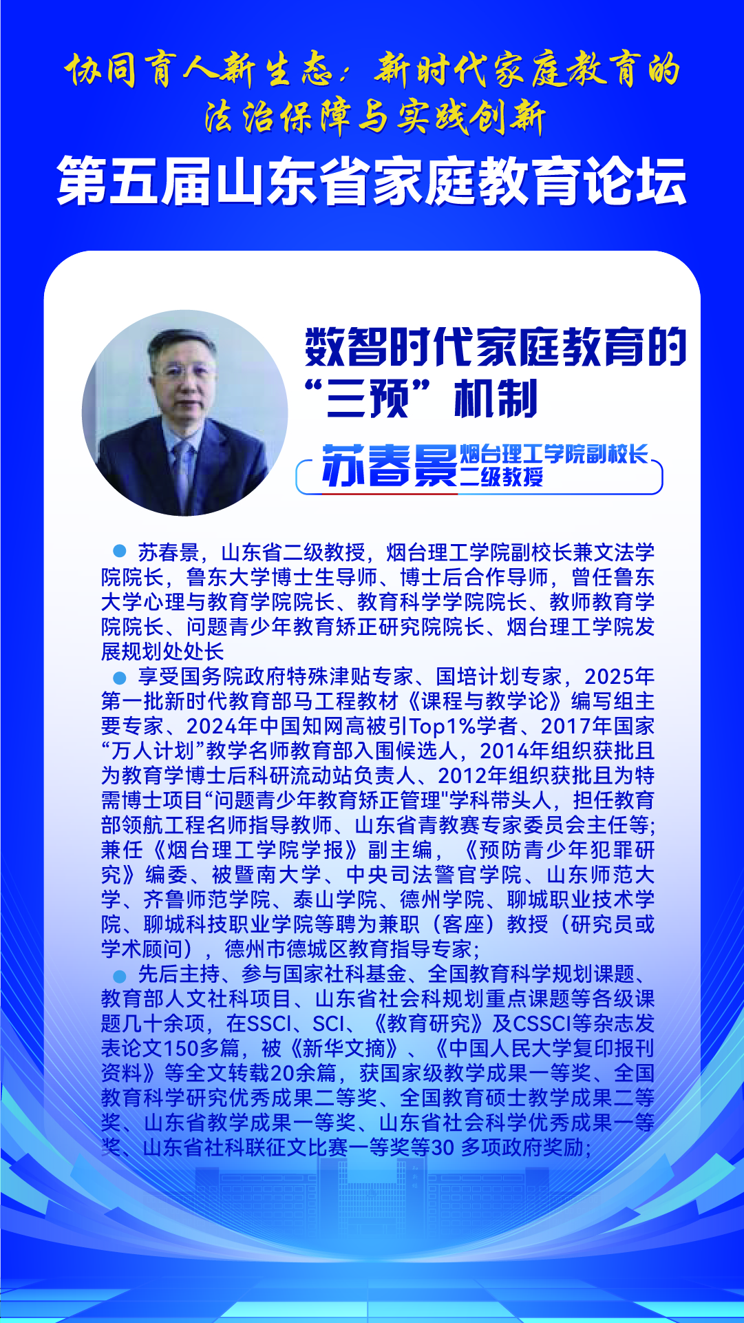 专家简介:苏春景,山东省二级教授,烟台理工学院副校长兼文法学院院长,鲁东大学博士生导师、博士后合作导师,曾任鲁东大学心理与教育学院院长、教育科学学院院长、教师教育学院院长、问题青少年教育矫正研究院院长、烟台理工学院发展规划处处长,享受国务院政府特殊津贴专家、国培计划专家,2025年第一批新时代教育部马工程教材《课程与教学论》编写组主要专家、2024年中国知网高被引Top1%学者、2017年国家“万人计划”教学名师教育部入围候选人,2014年组织获批且为教育学博士后科研流动站负责人、2012年组织获批且为特需博士项目“问题青少年教育矫正管理"学科带头人,担任教育部领航工程名师指导教师、山东省青教赛专家委员会主任等;兼任《烟台理工学院学报》副主编,《预防青少年犯罪研究》编委、被暨南大学、中央司法警官学院、山东师范大学、齐鲁师范学院、泰山学院、德州学院、聊城职业技术学院、聊城科技职业学院等聘为兼职(客座)教授(研究员或学术顾问),德州市德城区教育指导专家;先后主持、参与国家社科基金、全国教育科学规划课题、教育部人文社科项目、山东省社会科规划重点课题等各级课题几十余项,在SSCl、SCI、《教育研究》及CSSCⅠ等杂志发表论文150多篇,被《新华文摘》、《中国人民大学复印报刊资料》等全文转载20余篇,获国家级教学成果一等奖、全国教育科学研究优秀成果二等奖、全国教育硕士教学成果二等奖、山东省教学成果一等奖、山东省社会科学优秀成果一等奖、山东省社科联征文比赛一等奖等30 多项政府奖励。