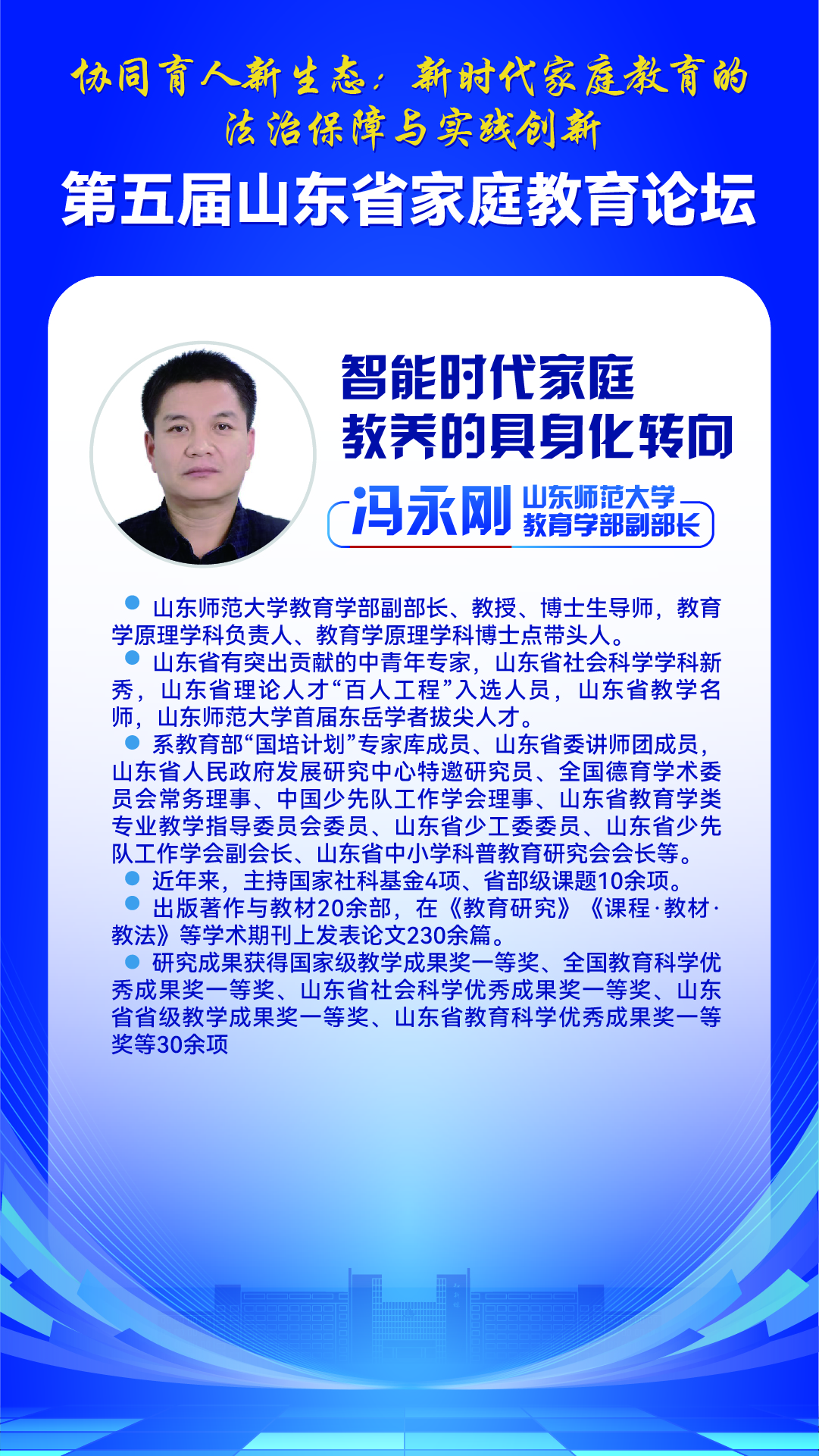 专家简介:冯永刚,山东师范大学教育学部副部长、教授、博士生导师,教育学原理学科负责人、教育学原理学科博士点带头人。山东省有突出贡献的中青年专家,山东省社会科学学科新秀,山东省理论人才“百人工程”入选人员,山东省教学名师,山东师范大学首届东岳学者拔尖人才。系教育部“国培计划”专家库成员、山东省委讲师团成员,山东省人民政府发展研究中心特邀研究员、全国德育学术委员会常务理事、中国少先队工作学会理事、山东省教育学类专业教学指导委员会委员、山东省少工委委员、山东省少先队工作学会副会长、山东省中小学科普教育研究会会长等。近年来,主持国家社科基金4项、省部级课题10余项。出版著作与教材20余部,在《教育研究》《课程·教材·教法》等学术期刊上发表论文230余篇。研究成果获得国家级教学成果奖一等奖、全国教育科学优秀成果奖一等奖、山东省社会科学优秀成果奖一等奖、山东省省级教学成果奖一等奖、山东省教育科学优秀成果奖一等奖等30余项。