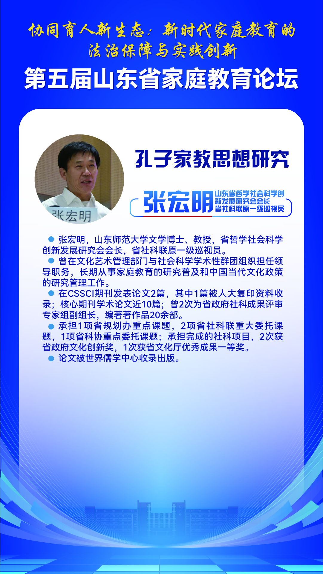 专家简介:张宏明,山东师范大学文学博士、教授,省哲学社会科学创新发展研究会会长,省社科联原一级巡视员。曾在文化艺术管理部门与社会科学学术性群团组织担任领导职务,长期从事家庭教育的研究普及和中国当代文化政策的研究管理工作。在CSSCI期刊发表论文2篇,其中1篇被人大复印资料收录;核心期刊学术论文近10篇;曾2次为省政府社科成果评审专家组副组长,编著著作品20余部。承担1项省规划办重点课题,2项省社科联重大委托课题,1项省科协重点委托课题;承担完成的社科项目,2次获省政府文化创新奖,1次获省文化厅优秀成果一等奖。论文被世界儒学中心收录出版。