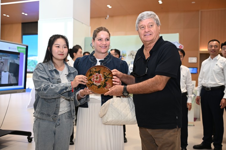 代表团一行首先在知信楼观看了学校宣传片,并参观了“知古鉴今 艺展黄海”中华优秀传统文化作品展、知信楼智慧教室、惠灵顿学院等地,现场了解了学校“四文化”融合育人特色、开放办校的发展战略以及国际交流合作的开展情况。参观过程中,刘常青董事长向代表团一行赠送了中华传统非遗手工艺纪念品并合影留念。