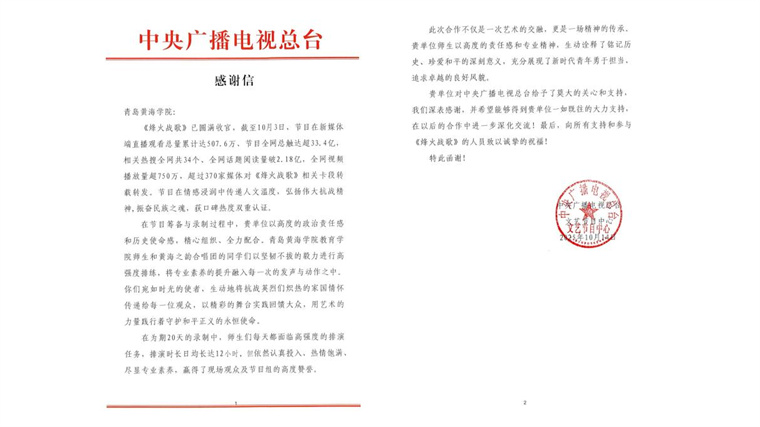 中央广播电视总台在感谢信中特别指出,我校师生以高度的政治责任感和历史使命感,生动诠释了铭记历史、珍爱和平的深刻主题,展现了新时代青年昂扬向上的精神风貌。此次合作既是高水平的艺术实践,更是一堂深刻的爱国主义教育大课。