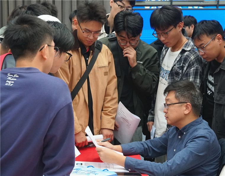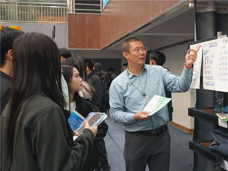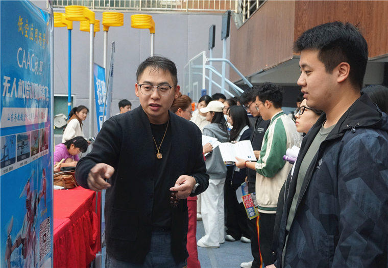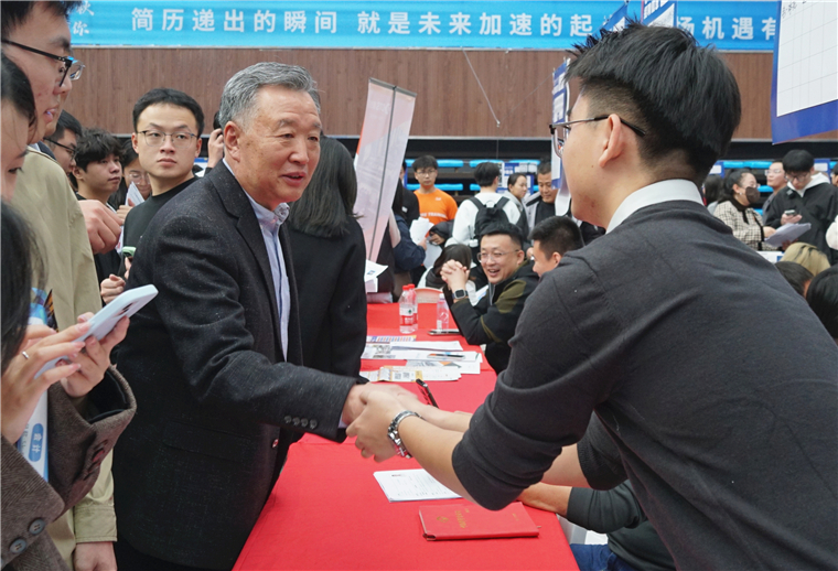 招聘会现场,校长李清山、党委书记李东、副校长刘纪新等学校领导与学生和企业面对面交流,询问招聘岗位、毕业生简历投递等情况,了解人才招聘需求和建议。