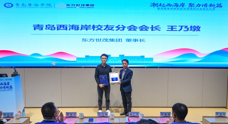 孟广东、刘常江等与会领导分别为新当选的会长、副会长、秘书长、副秘书长及理事颁发了聘书。在全场热烈的掌声中,孟广东、刘常江与新任会长王乃墩共同按下了象征分会正式成立的启动键,并为“青岛黄海学院校友会西海岸分会”铜牌揭牌,标志着青岛西海岸校友正式拥有了属于自己的“校友之家”。