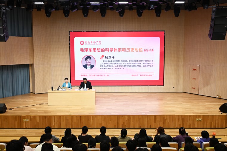11月13日,山东省社会主义学院特聘三级教授、山东省委讲师团宣讲专家杨翠伟教授到青岛黄海学院作题为《毛泽东思想的科学体系和历史地位》的专题报告,马克思主义学院教师代表以及师生党员、入党积极分子代表等260余人现场聆听了报告。报告会由学校党委委员、纪委书记、学生工作部部长赵国光主持。