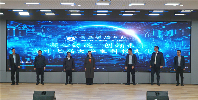 在全场热烈的掌声中,青岛西海岸新区科学技术协会副主席、二级调研员卜瑕,青岛西海岸新区科学技术协会学会部主任徐继武,青岛黄海学院党委委员、副校长刘纪新,党委委员、纪委书记、学生工作部部长赵国光,党委委员、宣传部部长李镇江,科研服务部副部长刘华,教学工作部副部长刘浩共同为本届科技文化节启动开幕。