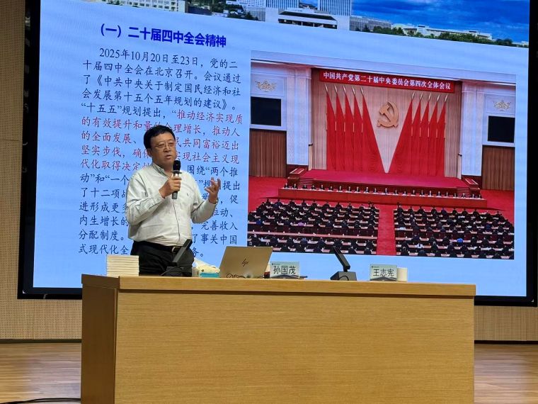 孙国茂教授围绕“加快建设金融强国”的核心目标,系统解读了全会关于科技金融、绿色金融、普惠金融等“五篇大文章”的战略部署,结合地方债务风险防范、金融监管创新等重点任务,用通俗案例拆解专业理论,让师生清晰把握金融发展与国家安全、高质量发展的内在关联。