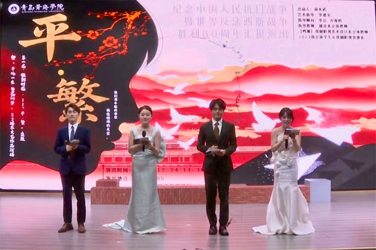 2025年12月24日下午,青岛黄海学院影视学院2023级播音与主持艺术本科1班在校内成功举办了文艺作品演播课程期末展演暨第一届雕刻时光“平·繁”主题朗诵会,以纪念中国人民抗日战争暨世界反法西斯战争胜利80周年。本次演出由播音系孙豪老师指导,以“平凡与繁花”为精神内核,通过朗诵、配音、音乐剧、寓言表演等多种形式,展现了播音学子扎实的专业功底与真挚的艺术表达,赢得了在场师生与嘉宾的一致好评。