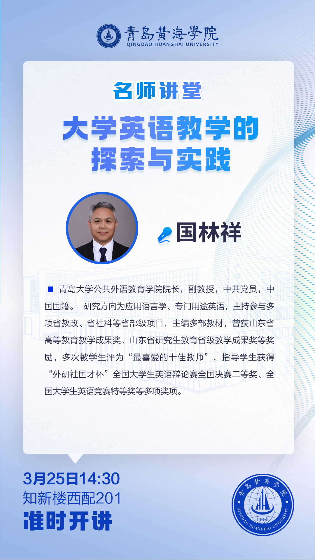 专家简介:国林祥,青岛大学公共外语教育学院院长,副教授,中共党员。 研究方向为应用语言学、专门用途英语,主持参与多项省教改、省社科等省部级项目,主编多部教材,曾获山东省高等教育教学成果奖、山东省研究生教育省级教学成果奖等奖励,多次被学生评为“最喜爱的十佳教师”,指导学生获得“外研社国才杯”全国大学生英语辩论赛全国决赛二等奖、全国大学生英语竞赛特等奖等多项奖项。