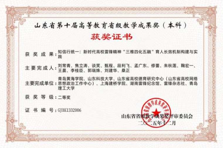 山东省高等教育教学成果奖由山东省人民政府批准设立、山东省教育厅组织评审,每四年评选一次,是全省高等教育领域规格最高、权威性最强、影响力最广的教学类奖项,集中体现高校落实立德树人根本任务、深化教育教学改革、提升人才培养质量的标志性成效。