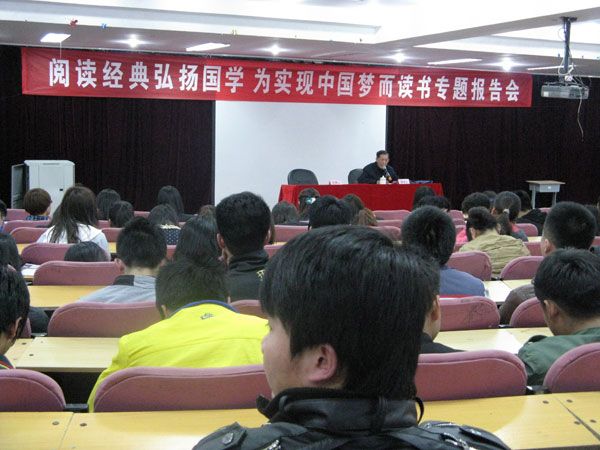 4月23日是世界读书日,今年世界读书日主题是: 阅读,让我们的世界更丰富。为了让更多的人喜欢读书,弘扬我国的经典文化,图书馆邀请国学院于善勤教授,于4月25日下午在一号教学楼一楼东配做了一堂题为“阅读经典,弘扬国学”的报告会。 于校长生动有趣向大家讲解了国学的范畴和内容,并向大家推荐了诸子百家的名言名篇,使同学们受益匪浅。