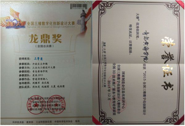 同时,由于我校积极组织学生参加大赛以及在暑假承办了大赛组委会组织的“3D打印和逆向设计方向”的教师培训,我校荣获“2015全国三维数字化创新设计大赛优秀组织奖”。