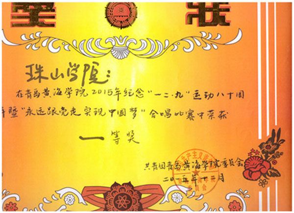 2015年12月11日,在青岛黄海学院举办的纪念 “一二·九”运动八十周年“永远跟党走 实现中国梦”合唱大赛中,珠山学院呈现的《我和我的祖国》、《团歌》两个节目荣获一等奖。