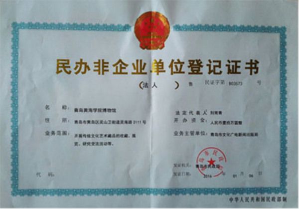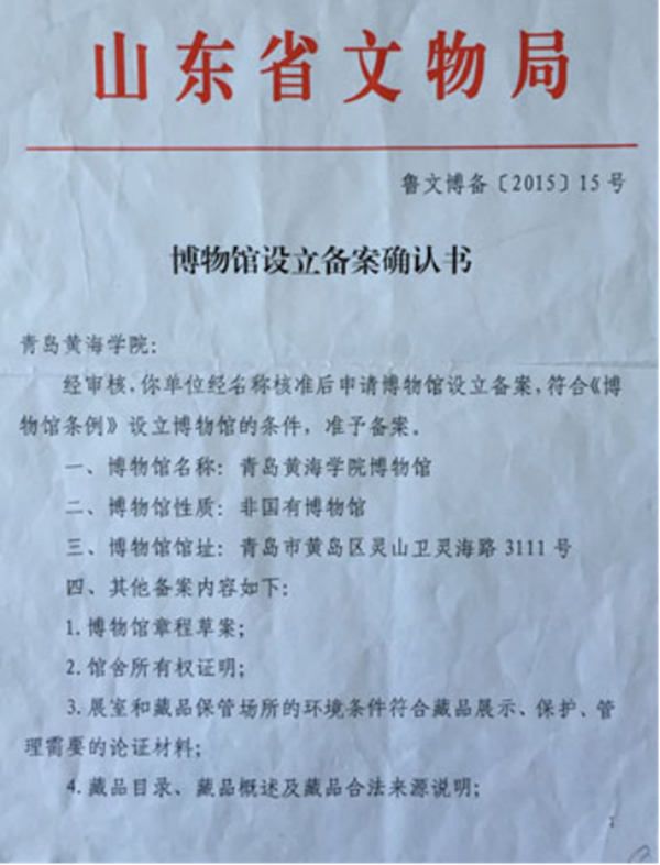 我校传来好消息,青岛黄海学院博物馆已取得民营非企业单位注册登记证(民政字第B03573号),并陆续在相关主管部门完成全部登记注册手续。同时山东省文物局已批复同意成立青岛黄海学院博物馆,这是山东省内继山东大学后审批的第二个高校博物馆,也是全省目前唯一的第一家民办高校博物馆。