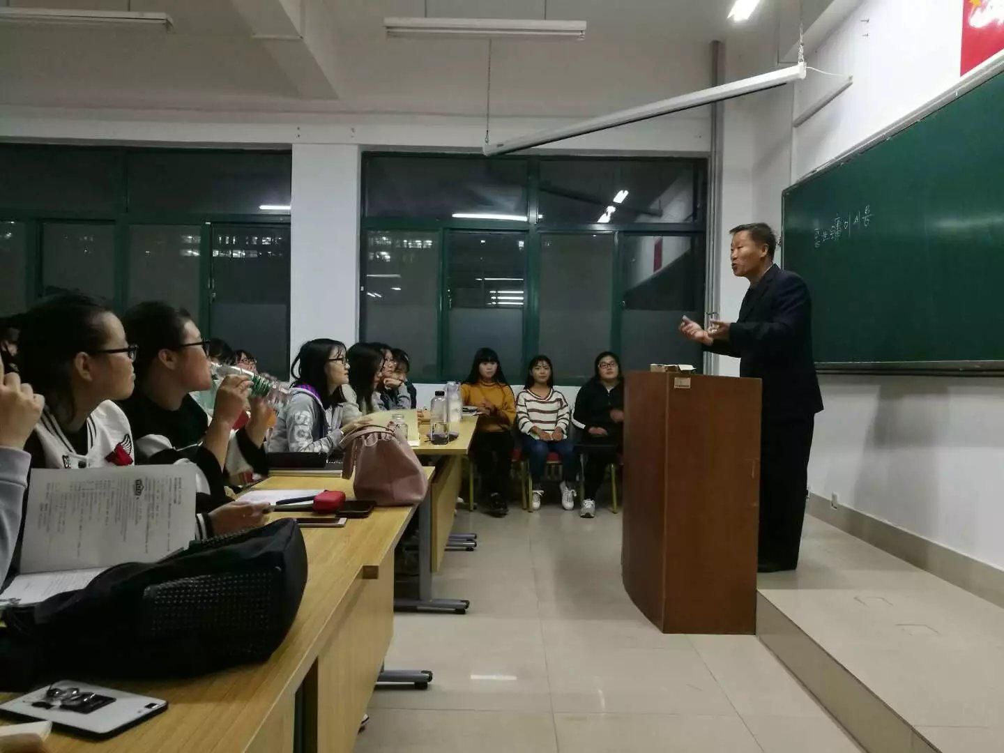 本次韩语基础班培训共计60课时,每周一、周四晚自习上课。基础班结束后,学生将达到韩语等级考试2级(最高为6级)水平。李教授专业的韩语授课激发了学生们的兴趣,课后大家纷纷提出各种问题,李教授均给与了热情解答。