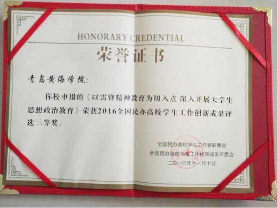 在本届全国民办高校学生工作创新研讨会上,我校申报的作品《以雷锋精神教育为切入点、深入开展大学生思想政治教育》荣获2016全国民办高校学生工作创新成果评选三等奖。