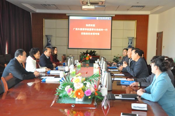 11月11日下午,广西外国语学院董事长朱桂玲一行4人到我校考察交流。副校长梁希泉、党委副书记宋庆泽、校长助理、综合办公室主任马永来等学校领导热情接待了来访的客人。双方在行政楼201会议室举行座谈交流会。
