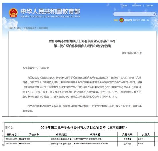 2016年第二批产学合作协同育人项目申报由教育部高等教育司组织,通过我院计算机科学与技术专业负责人与合作企业的洽谈、积极筹备,我院与东软睿道教育信息技术有限公司、蓝鸥科技有限公司分别合作的两个项目“计算机类教学内容和课程体系改革”、“基于MOOC+翻转课堂的混合式教学改革实践”均成功获批,这标志着我院计算机学科专业校企协同育人模式的提升,也为校企深入合作打开新的思路。