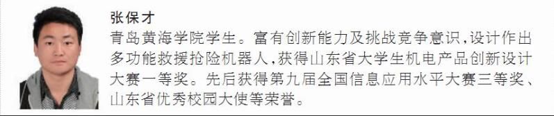 张保才同学是校园里的“大忙人”,学习、社会实践、创业创新、社团活动,都能看到他干劲十足的身影。他担任班级团支书、电子创新协会会长,拥有国家实用新型专利,获过省级科技论文三等奖、“山东省大学生机电产品创新设计竞赛”一等奖、“山东省第三届机器人大赛”一等奖、“山东省大学生科技文化节机器人大赛”一等奖、“首届山东省大学生科技创新大赛”一等奖,“中国大学生自强之星”提名奖。他的辅导员曹传剑老师说:“张保才这个学生不论学习还是人品都非常好,他知道自己要什么,也知道努力才能有收获,对班里其他同学也起到了很好的带动作用。”而张保才同学本人始终以“一山更比一山高”激励自己,只有更加努力才能不断向前,最终实现自己的人生价值。