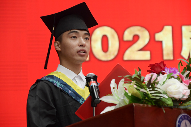 智能制造学院2017级机械设计制造及自动化学生单长鹏代表全体毕业生向母校致以最崇高的敬意和最诚挚的感谢,他回顾了四年难忘的学习生涯,经历并见证着新中国成立70周年、建党100周年和学校建校25周年等重要时刻,号召所有毕业生争做学校发展的助力者,在新的人生征程中始终铭记“知行合一”的校训和“惟德惟能,止于至善”的校风,不忘母校之恩,不负时代使命,紧跟党的步伐,用学校赋予的智慧描绘出靓丽的人生风景线!