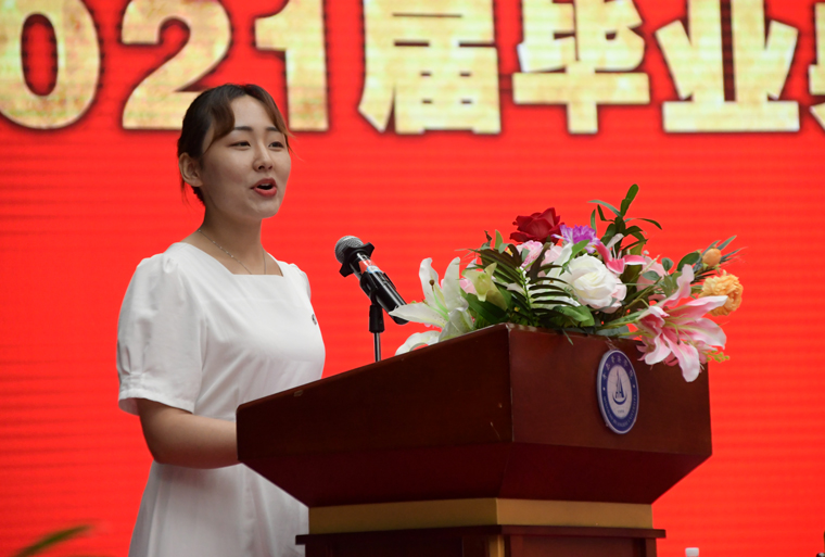 建筑工程学院2018级工程造价学生郑亚男代表全体在校生向毕业生表达最衷心的祝愿。她祝福学长学姐们都能以青春之我、奋斗之我,为祖国的建设添砖加瓦,号召所有在校生接过毕业生的接力棒,以实际行动,继续为学校发展贡献青春和力量!