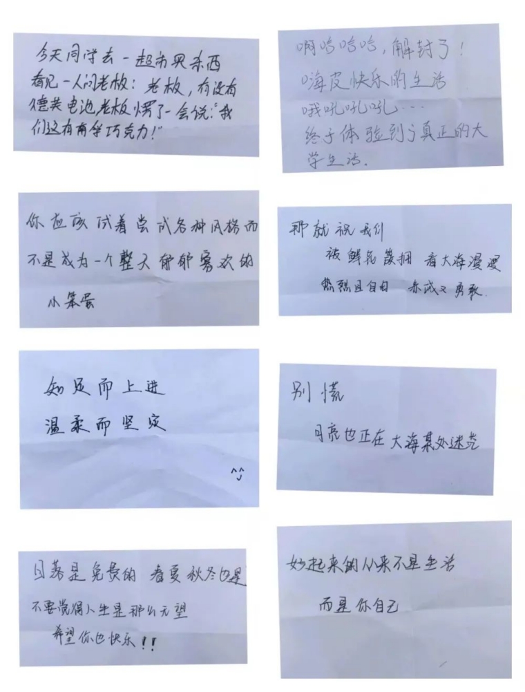 在活动现场,同学们纷纷拿起笔,在便签纸上记录自己的心声。一张张便签纸或被投放进“烦恼信箱”,或被投放进“快乐信箱”。“快乐信箱”里的便签又被一张张抽走。展开快乐便签,周围的同学便凑了过来。未等读完,大家就嘴角上扬,眼睛就笑成了一条线……